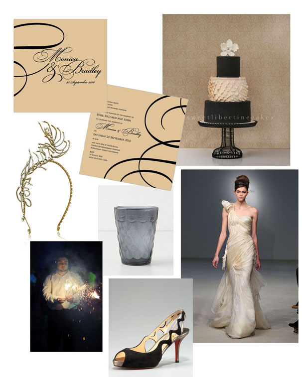 Above: Clockwise from top left; Alannah Rose Mediterranean Muse wedding invitation; Lisa Ho silk one shouldered gown; Lisa Ho leaf motif crystal necklace; Michael Kors strap back maxi dress from Nordstrom; Image via Martha Stewart – Brian Atwood “Starlet” pumps, saksfifthavenue.com; Rupert Sanderson “Cerise” peep-toes.