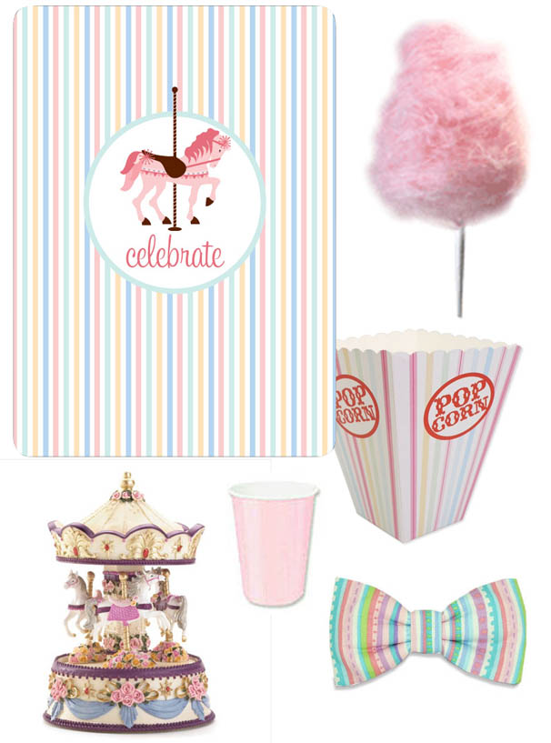 Clockwise from top left: Alannah Rose Take me To The Fair Party Invitation, fairy floss from Popcorn.com.au, Gelati stripe popcorn box from Pink Frosting, pink cups from Posh In A Box, bowtie from Swagger & Swoon, Musical Merry Go Round from Merry Treasure Shopper