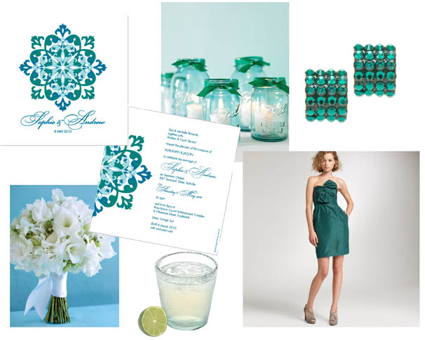 Clockwise from top left: Alannah Rose Emerald Gem Invitation, tealight holders from Martha Stewart Weddings, sugar coated studs from Kate Spade, Taffeta bridesmaids dress from J.Crew, margarita from Brides, bouquet from Brides.