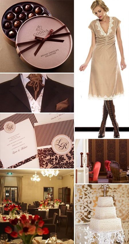 Clockwise from top left: Godiva Mousse Chocolate Collection, Fancy That! dress by Rose and Ruby Venue Setting The Tea Room QVB , Cake by Tomas Paulina and Lidiya Zdrok via www.brides.com , Venue The Tea Room Gunner’s Barracks , Hollywood Riches chocolate and latte wedding invitations by Alannah Rose, Jack Bunney’s Brown Wedding Suit
