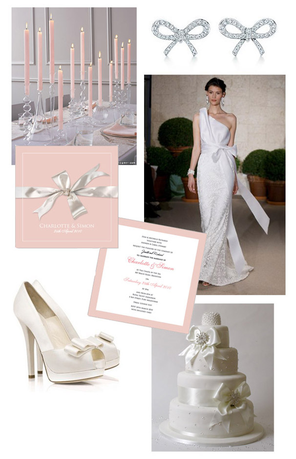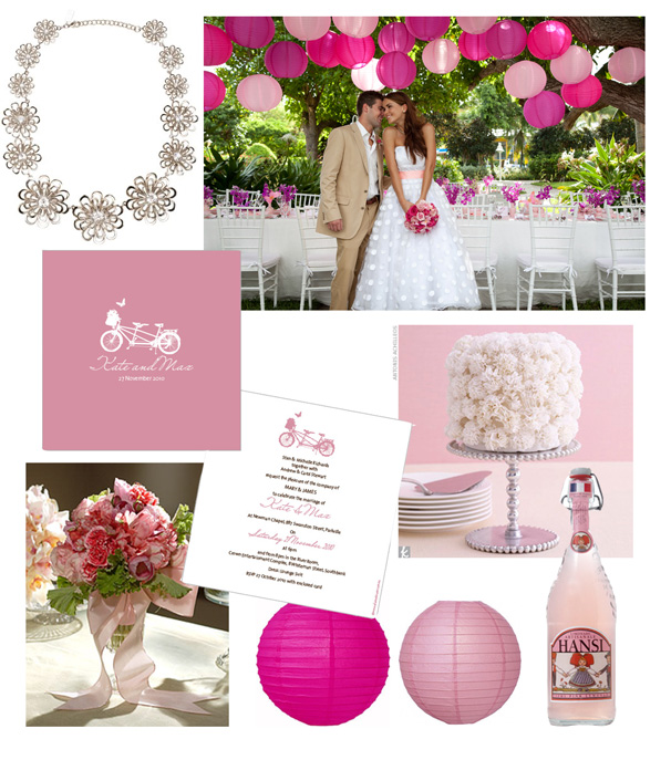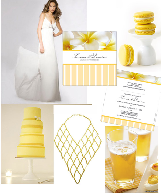 Clockwise from top left: Gown from Wendy Makin, Lemon Macarons from Paulette’s Macarons, Alannah Rose Frangipani Dance Wedding Invitation, Martha Stewart Lemon Shandys, Necklace by Malene Birger from Net A Porter, Cake from Brides.