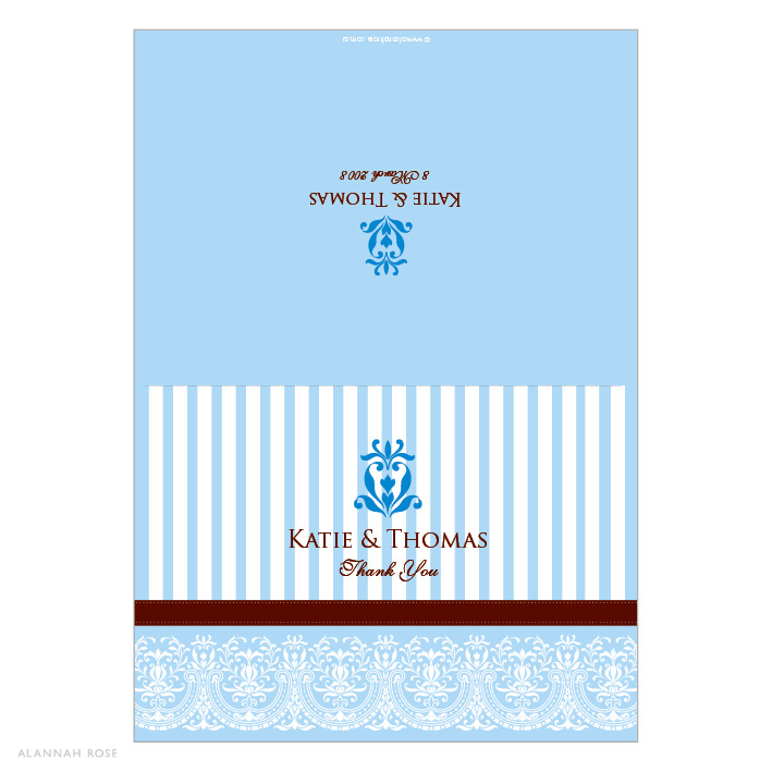 Thank You cards are folding note card style and come with white envelopes. Printed on a high quality Satin Deluxe card stock. Shimmer or Textured card stock is available at an additional charge. Thank You cards are blank inside for you to write your own personal message. Alternatively you can select to have a generic message printed inside for an additional charge. Folded size 140 x 105mm.