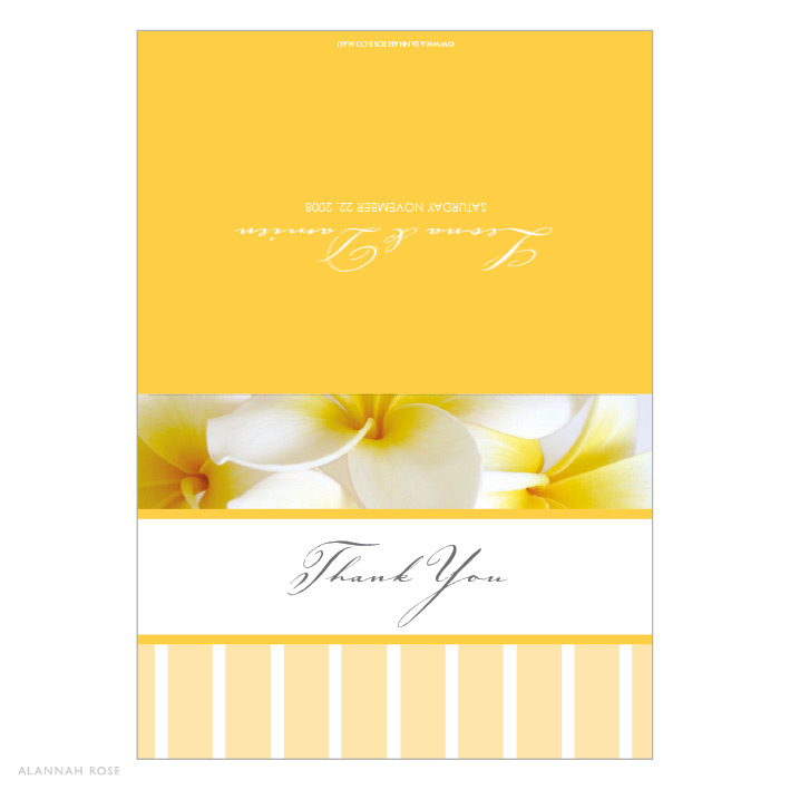 Thank You cards are folding note card style and come with white envelopes. Printed on a high quality Satin Deluxe card stock. Shimmer or Textured card stock is available at an additional charge. Thank You cards are blank inside for you to write your own personal message. Alternatively you can select to have a generic message printed inside for an additional charge. Folded size 140 x 105mm.