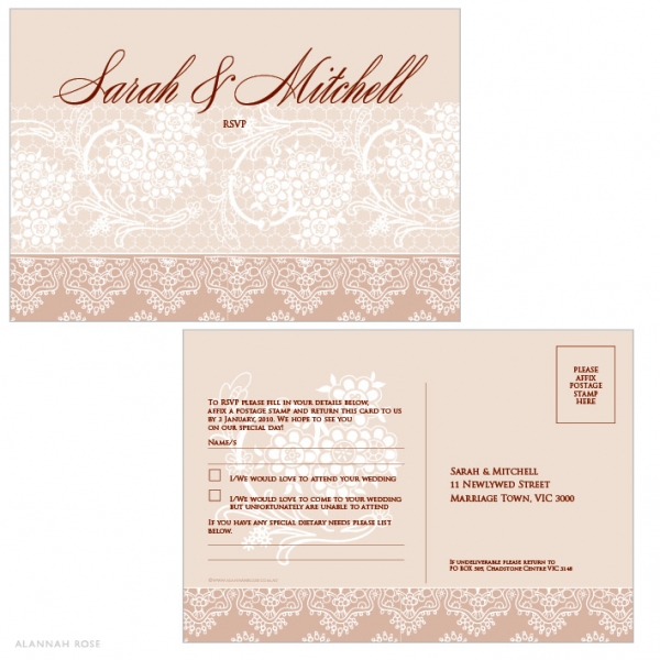 These beautiful RSVP postcards are printed double sided and are an easy and convenient way to have your guests RSVP. All they need to do is fill in their details, place a postage stamp on the back and post it – no envelopes required! Printed on a high quality Satin Deluxe card stock. Shimmer or Textured card stock is available at an additional charge. Flat size 140 x 100mm