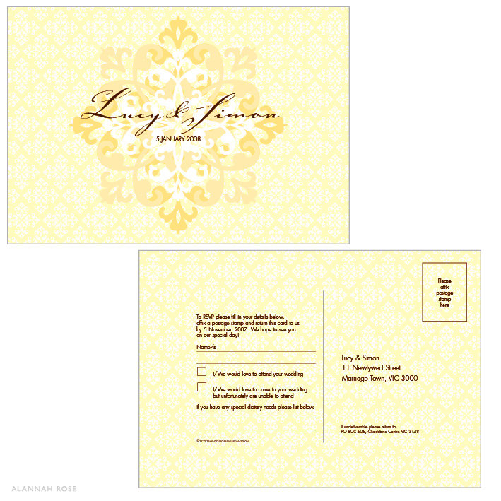 These beautiful RSVP postcards are printed double sided and are an easy and convenient way to have your guests RSVP. All they need to do is fill in their details, place a postage stamp on the back and post it – no envelopes required! Printed on a high quality Satin Deluxe card stock. Shimmer or Textured card stock is available at an additional charge. Flat size 140 x 100mm