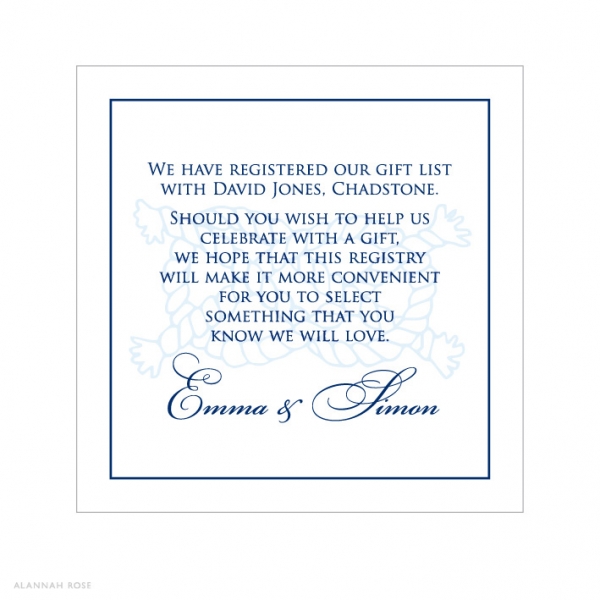 These cards are ideal for those wishing to advise guests of gift or wishing well ideas. They are printed to one side only on Satin Deluxe card stock, and are perfect for slipping into the envelope with the invitation. Shimmer or Textured card stock is available at an additional charge. For those with extra text, we can print to the reverse for an additional charge. Flat size 68x68mm