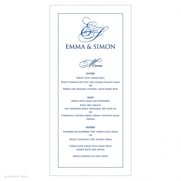 Stylish menu cards to tie your wedding theme together. Menu cards are a single DL size card printed to one side only on a 350gsm Satin Deluxe card stock. Shimmer or Textured card stock is available at an additional charge. Menu cards can also have your guest names personalised on them if you would like them to double as place cards. Please select the personalisation option if you require this. Flat size 210x100mm