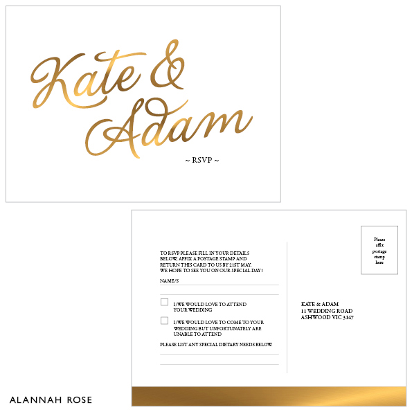 These beautiful RSVP postcards are printed double sided and are an easy and convenient way to have your guests RSVP. All they need to do is fill in their details, place a postage stamp on the back and post it – no envelopes required! Printed on a high quality Satin Deluxe card stock. Shimmer or Textured card stock is available at an additional charge. Other text colour options are available please see our colour chart for details. Note that the metallic colour of the bride and groom names cannot be changed. Flat size 140 x 100mm